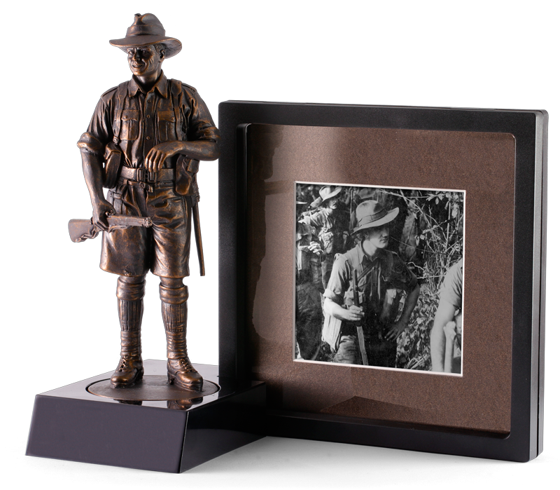 These stunning figurines depict a typical Australian infantryman in the Pacific theatre with his trusted SMLE rifle. His left arm rests on a large ammunition pouch that formed part of the basic 1937 pattern webbing, which also carried a bayonet and water bottle.