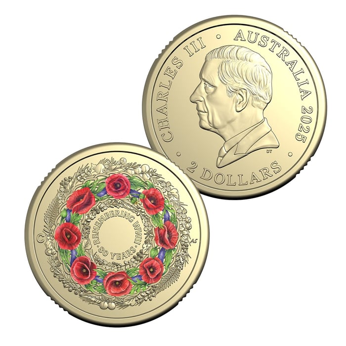 These stunning 2025 $2 Proof and Uncirculated Poppy Wreath coins feature eight red poppies — one for each decade since the guns fell silent — surrounded by sculpted leaves symbolising remembrance and renewal.