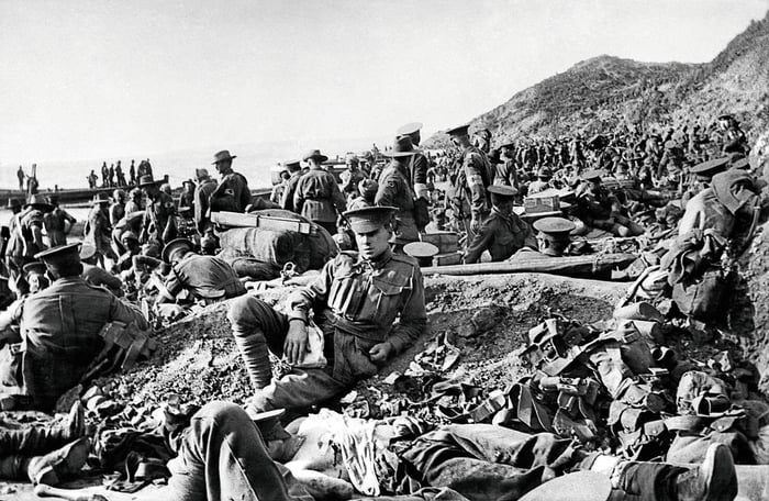Image: An Australian soldier lies wounded looking north along the beach, Anzac Cove 25 April 1915.