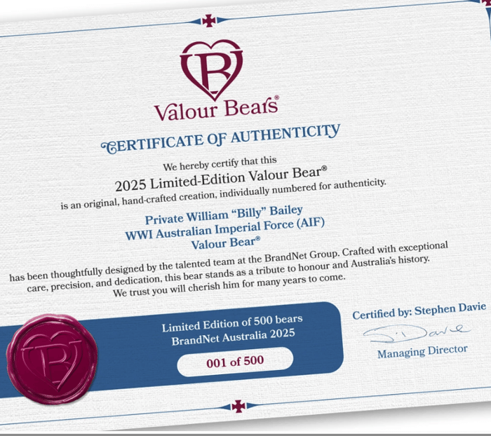 Each bear in the Valour Bears® range is carefully designed to reflect values associated with honour, resilience and remembrance. This thematic approach distinguishes them from many other premium teddy bears, which often focus solely on aesthetics or seasonal themes.