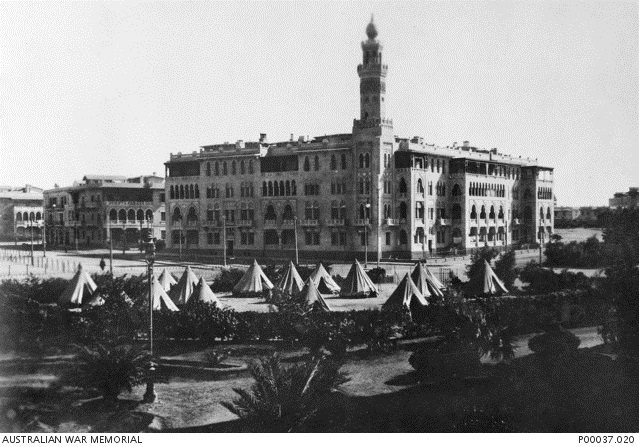 Image: Heliopolis Palace, Egypt. c. 1916. Elevated view of approximately fifteen tents occupied by 1st Australian General Hospital (1AGH). The tents were erected in the grounds as space inside the building became scarce.
