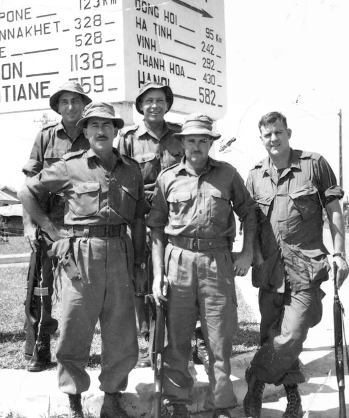 Members of the Australian Army Training Team Vietnam (AATTV). Left to right, back row: Warrant Officers P. M. Cerda-Pavia, B. F. Davis; Front Row: Major A. S. Hinds (Public Relations Officer visiting from Saigon), Warrant Officers R. J. Swanton (killed in action 1965-11-13) and G. C. Neitz (Formerly 200320)