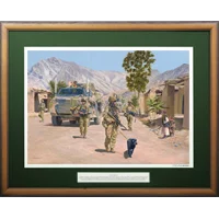 Barry Spicer's painting Operation Slipper - In Service Against Terrorism depicts soldiers of the Mentoring Task Force patrolling through a local village in the Uruzgan Valley during 2010. With a back drop of the steep mountains synonymous with the region the patrol draws interest from local children, as has been the case with many of the activities undertaken by Australians throughout their time in Afghanistan.
