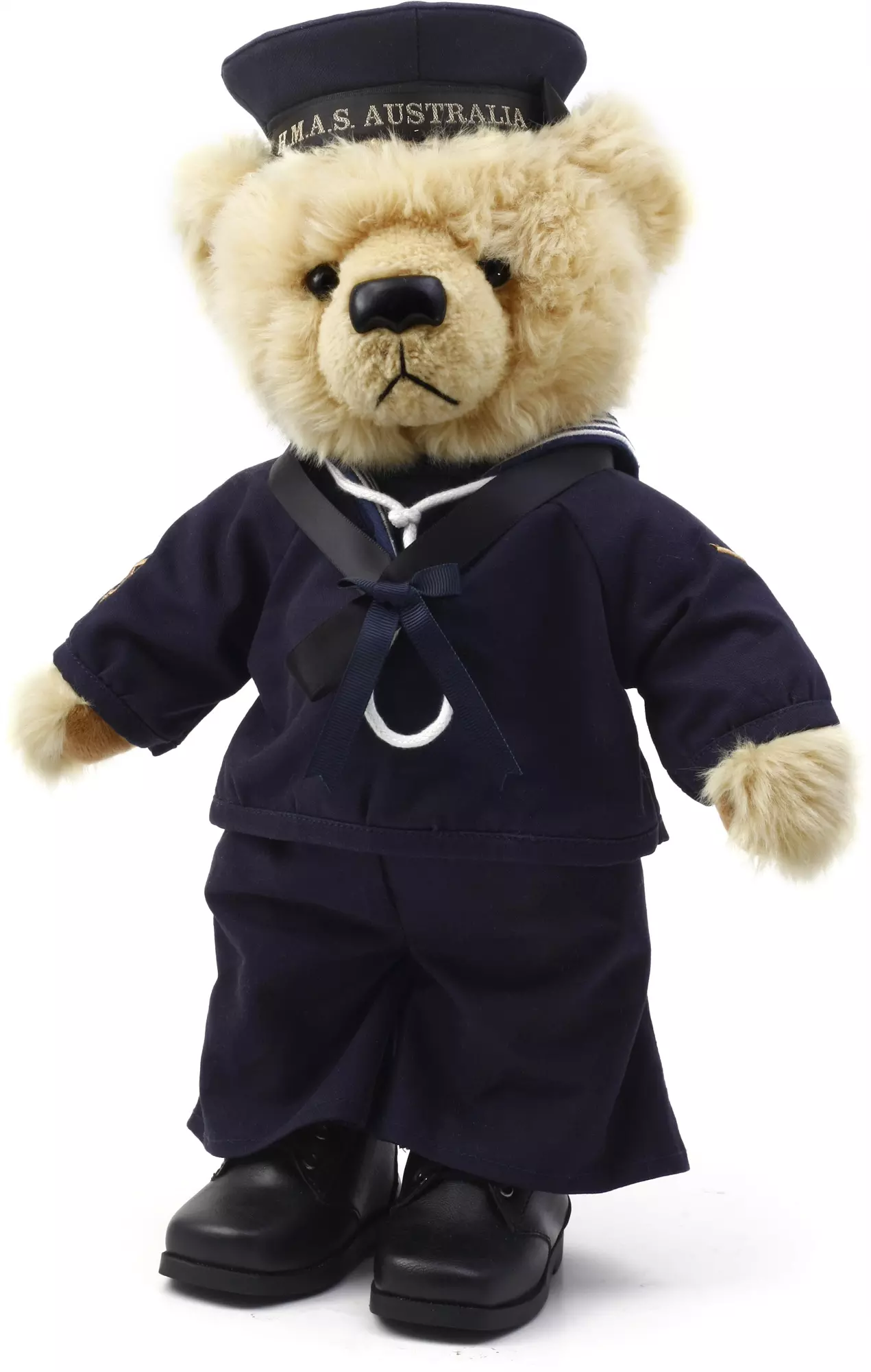 Able (Bodied) Seaman Andy Miller shares the story of the Royal Australian Navy during the Great War 1914-1918. The first Great War navy bear, he wears the Number 1 Dress Blue Serge Uniform with blue seaman's jumper and blue Class II cap with H.M.A.S. Australia (I) cap tally. Standing 40cm in his boots, AB Miller is limited to just 2,500 units worldwide. He comes with a numbered certificate of authenticity.