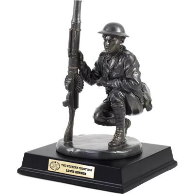 In 1916 the Australian Imperial Forces adopted the lighter air-cooled Lewis Gun. The Lewis gun's portability and versatility helped drive a fundamental rethink of infantry minor tactics. This fine cold cast bronze figurine stands 195mm and shows an Australian Machine Gun Company soldier with his new weapon. A piece of military history. Limited to only 5,000 castings.